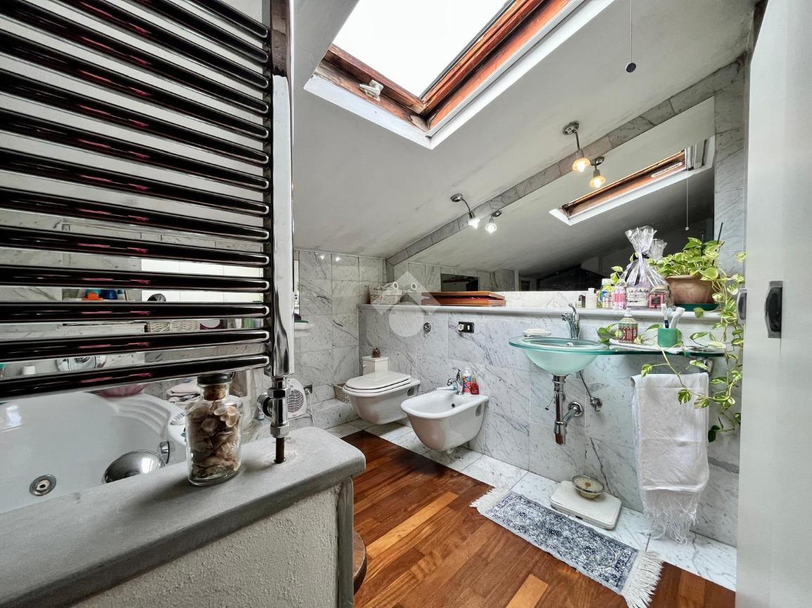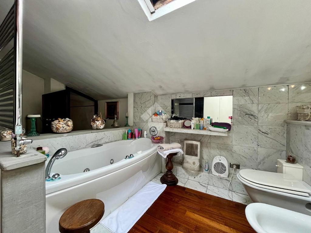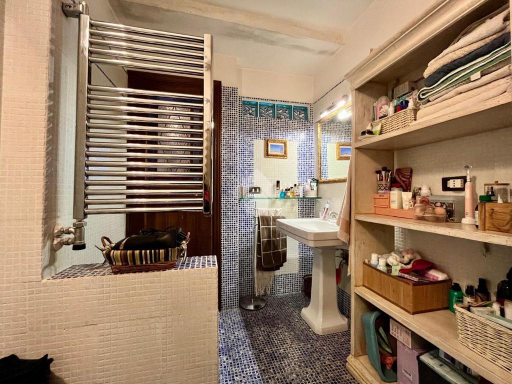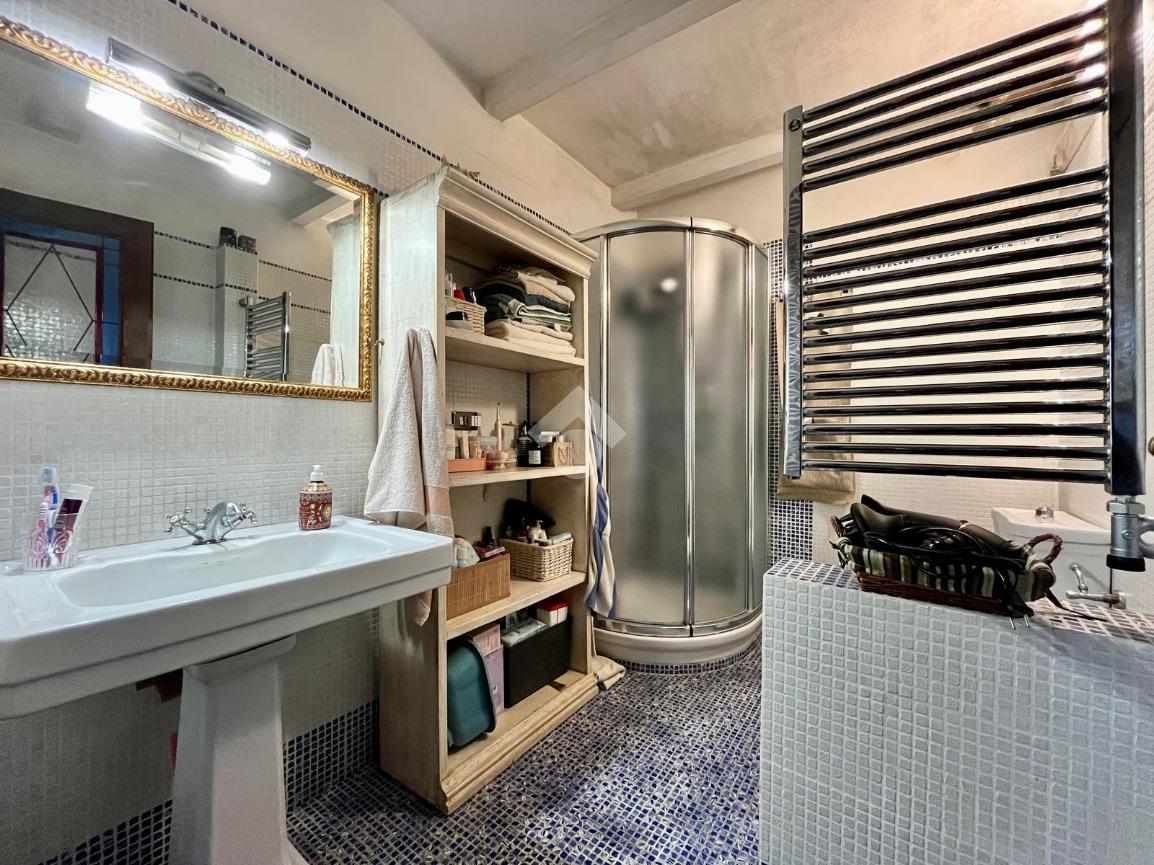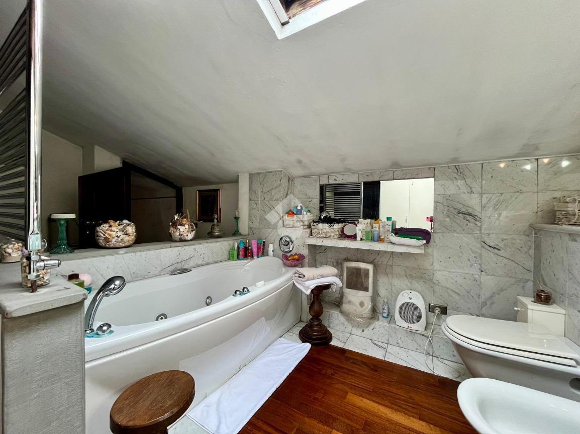 Al piano troviamo anche sue servizi igienici, uno padronale con doccia e finiture in mosaico ed uno più piccolo di servizio. Tornando nella prima sala troviamo due scale; una che scende, la quale porta al vano interrato dove troviamo una caratteristica taverna con volte a botte e mattoni a vista, arredata con cucina, un locale uso ripostiglio ed un terzo bagno con angolo lavanderia; una che sale e che porta al sottotetto praticabile, dove troviamo un quarto bagno con vasca, rifinito in marmo, illuminato ed arieggiato da una velux posta sul tetto ed un altro vano, il quale adesso è arredato a camera per gli ospiti ed uno spazio uso ripostiglio.