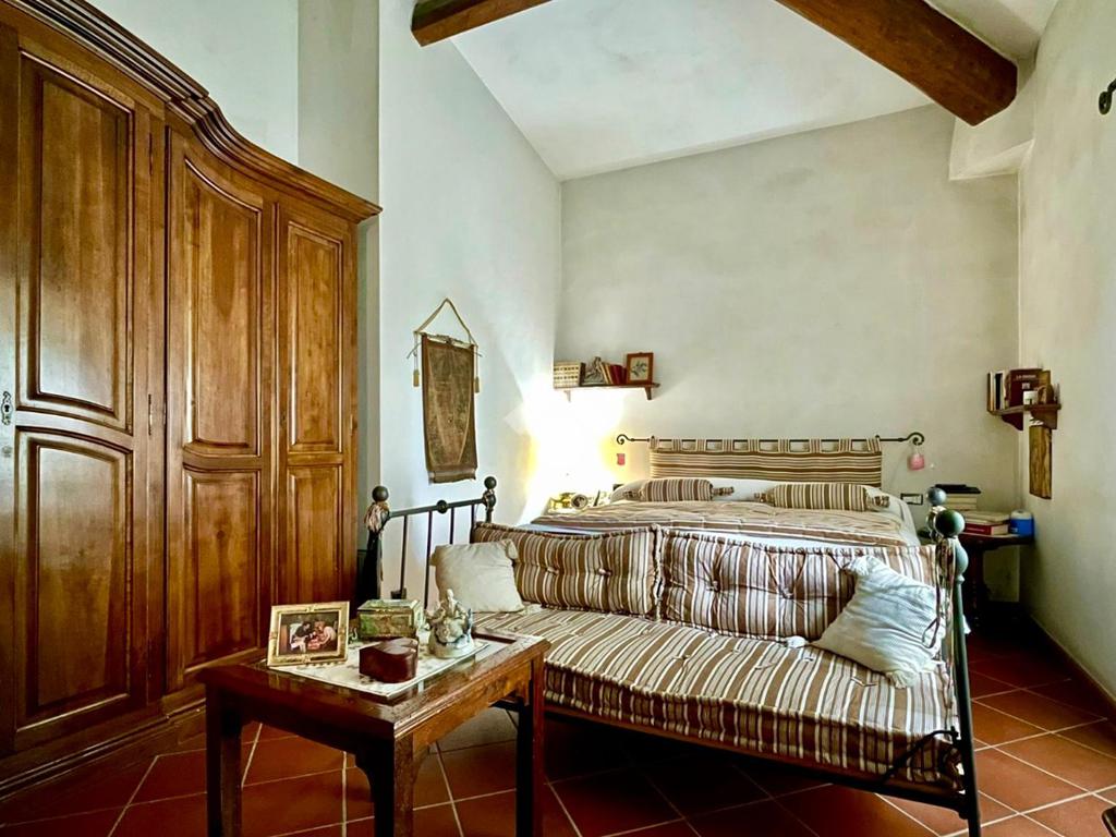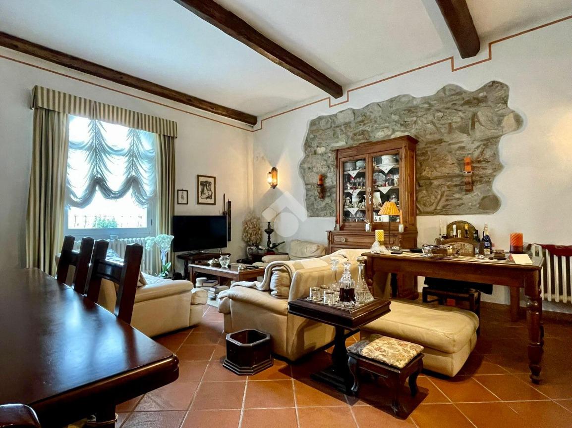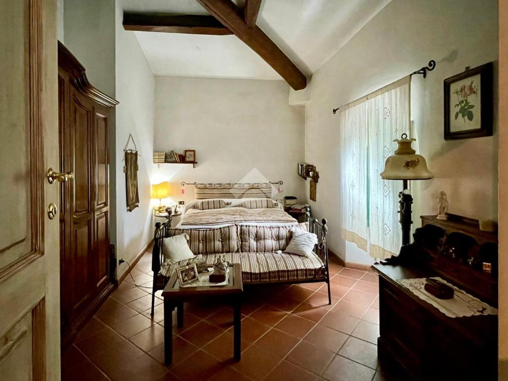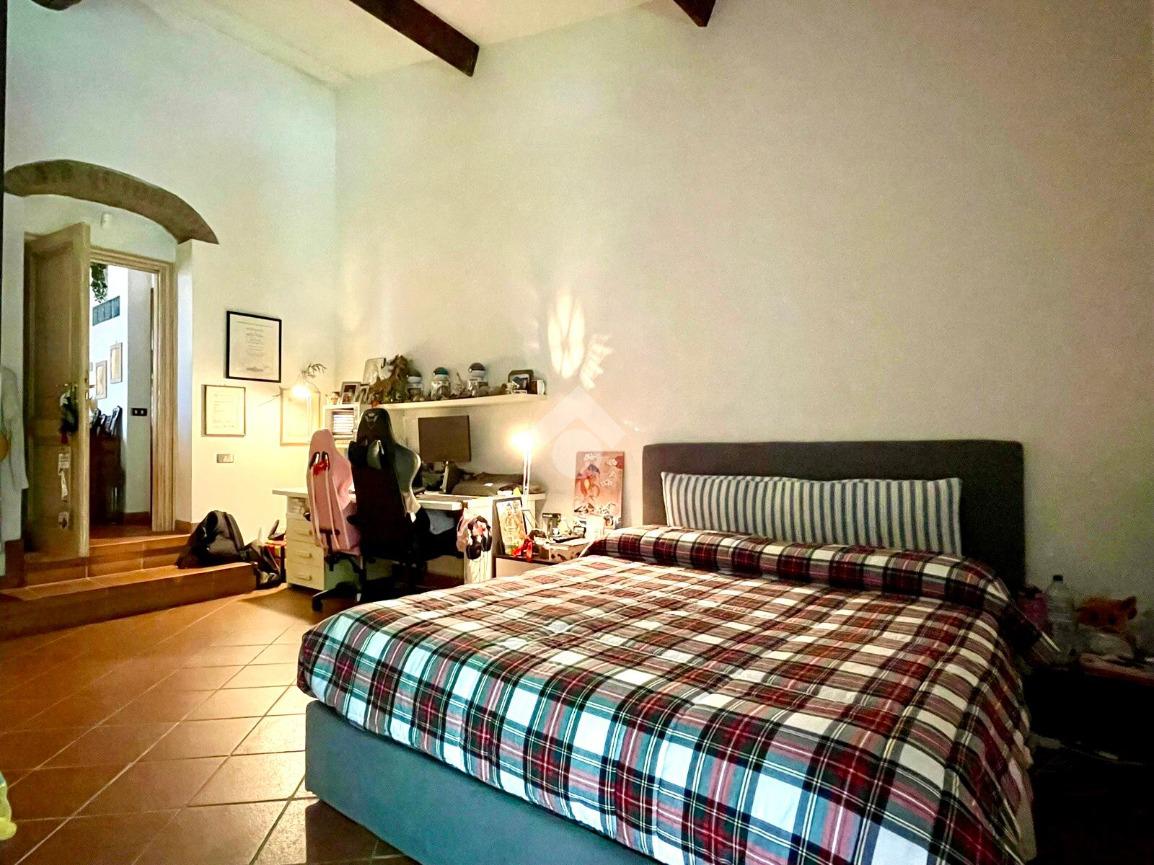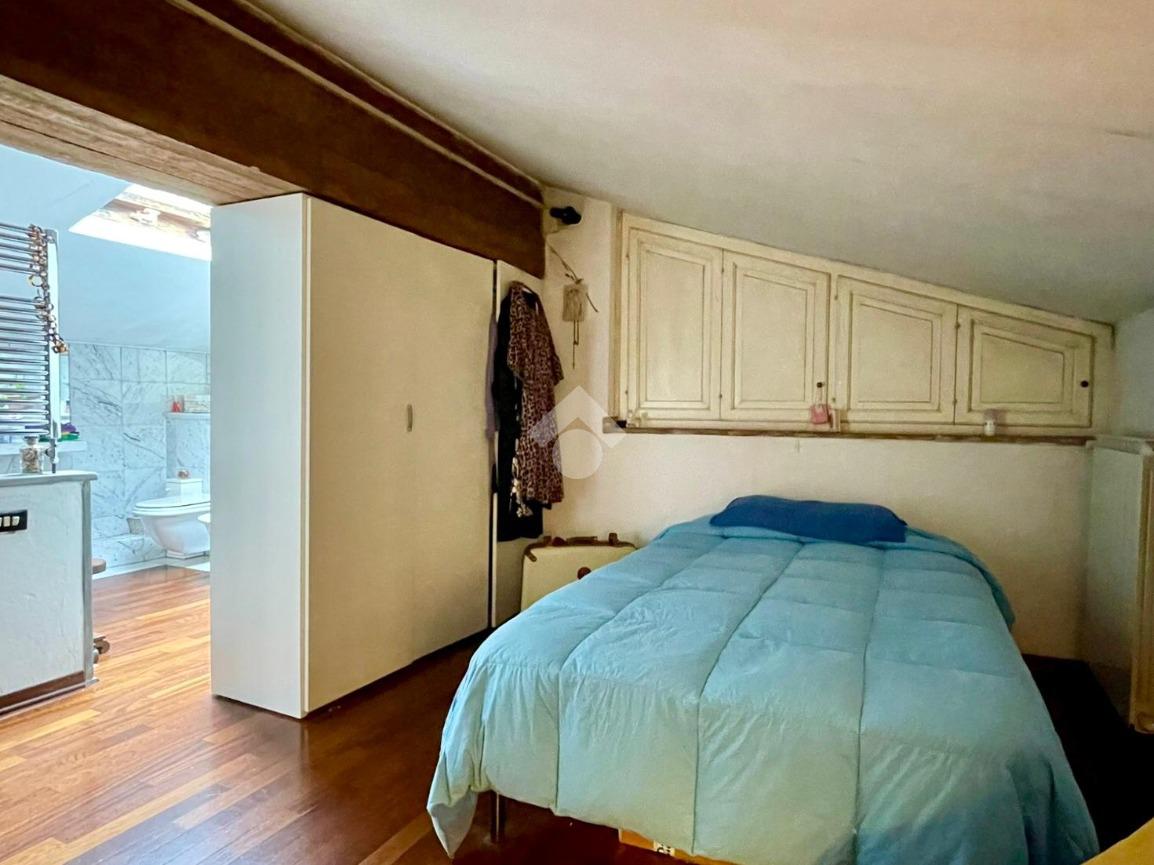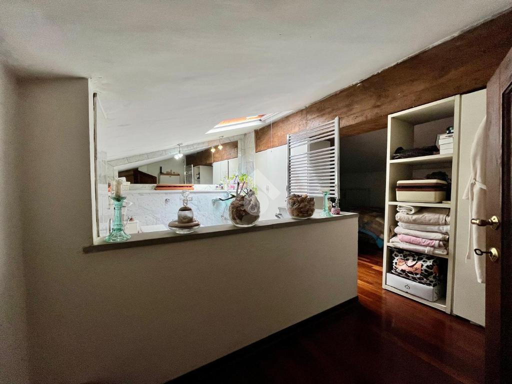 Al piano troviamo anche sue servizi igienici, uno padronale con doccia e finiture in mosaico ed uno più piccolo di servizio. Tornando nella prima sala troviamo due scale; una che scende, la quale porta al vano interrato dove troviamo una caratteristica taverna con volte a botte e mattoni a vista, arredata con cucina, un locale uso ripostiglio ed un terzo bagno con angolo lavanderia; una che sale e che porta al sottotetto praticabile, dove troviamo un quarto bagno con vasca, rifinito in marmo, illuminato ed arieggiato da una velux posta sul tetto ed un altro vano, il quale adesso è arredato a camera per gli ospiti ed uno spazio uso ripostiglio.