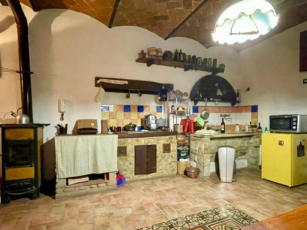 proseguendo entriamo nella zona giorno open-space, ampia ed accogliente, la quale è composta da una cucina a vista in muratura che si separa idealmente dal soggiorno - quest'ultimo provvisto di un'ampia finestra - nel quale è stato riportato in parte alla luce la struttura in pietra originale del muro.